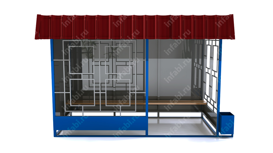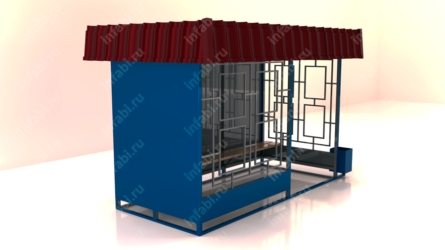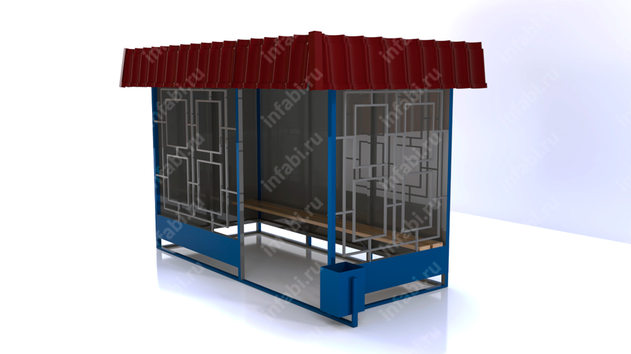 Остановочный павильон ОМ-3 имеет металлический каркас, который изготавливается в антивандальном исполнении. Это делает конструкцию устойчивой к вандализму и повреждениям, а также обеспечивает защиту от погодных условий. На крыше павильона козырек из металлочерепицы, что придает остановочному павильону привлекательный декоративный вид.