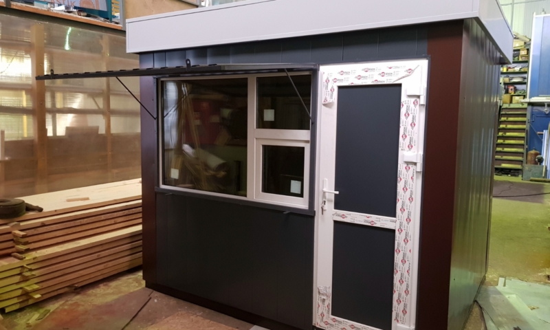 Наружная отделка торгового павильона подразумевает обшивку стен металлическими листами с цветным полимерным покрытием, а также монтаж окон и дверей из профиля и панелей ПВХ. Для защиты от несанкционированного доступа предусмотрен монтаж рольставней. Дополнительно устанавливается козырек, который закрывает вход и служит местом размещения вывесок.