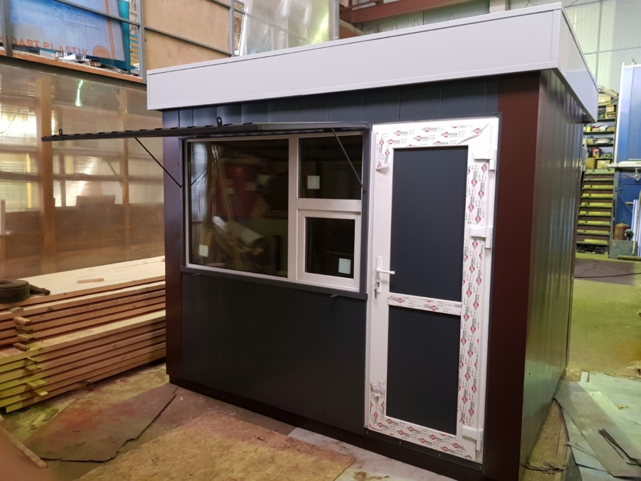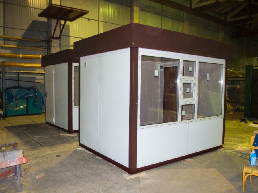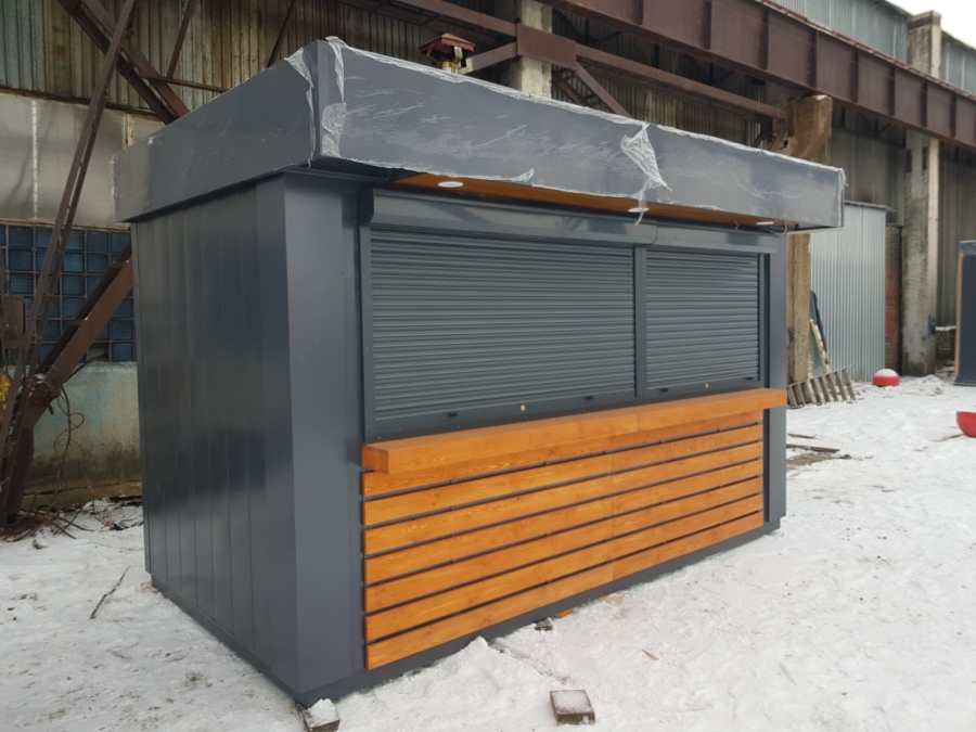 Наружная отделка торгового павильона подразумевает обшивку стен металлическими листами с цветным полимерным покрытием, а также монтаж окон и дверей из профиля и панелей ПВХ. Для защиты от несанкционированного доступа предусмотрен монтаж рольставней. Дополнительно устанавливается козырек, который закрывает вход и служит местом размещения вывесок.
