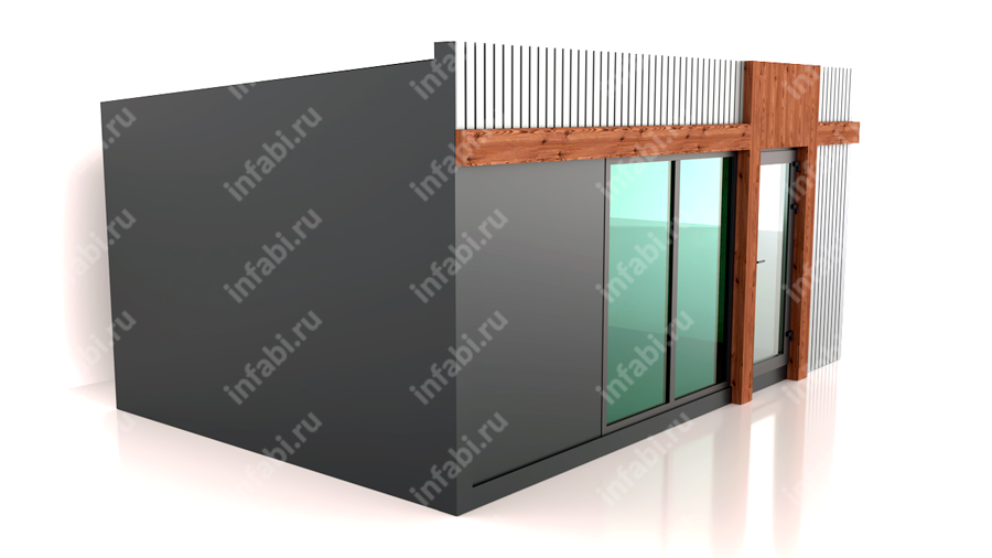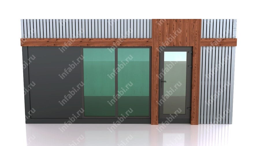 Модульный павильон «Бытовая техника» 6х4 м (тип 2 ) — торговый павильон со стильной и приятной внутренней и внешней отделкой и современным декором. Сочетание темных цветов внешней отделки с декоративными деревянными элементами также темных тонов выделяют торговый павильон такого типа в городской среде, что позволяет привлечь покупателей в торговую точку и сделать ее более представительной. В этой модели окна занимают не всю площадь фасада. Дверь располагается справа. Слева глухая стенка без декора.