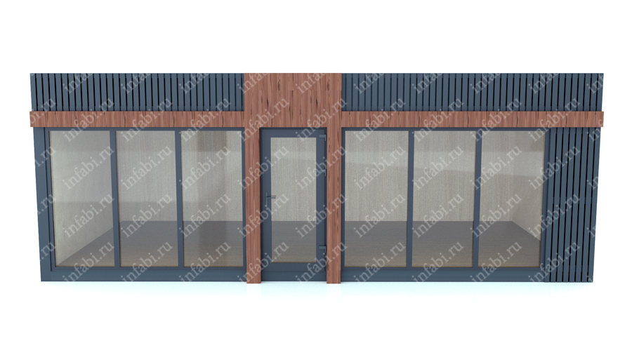 Окна и дверь изготавливаются высокими. Благодаря такой высоте окон на фронтальной части павильона остекление получается сплошным и создает большую обзорность. Располагаются на фасадной части павильона. Могут быть как с ламинацией, так и без нее.