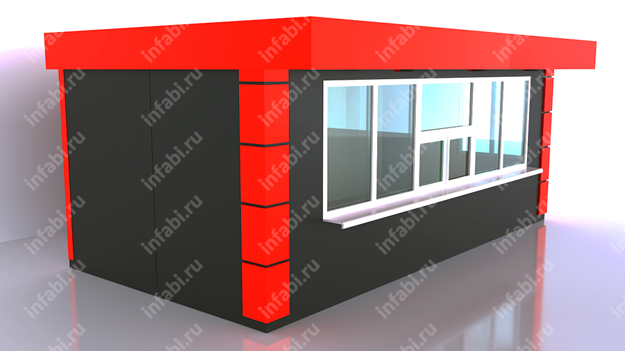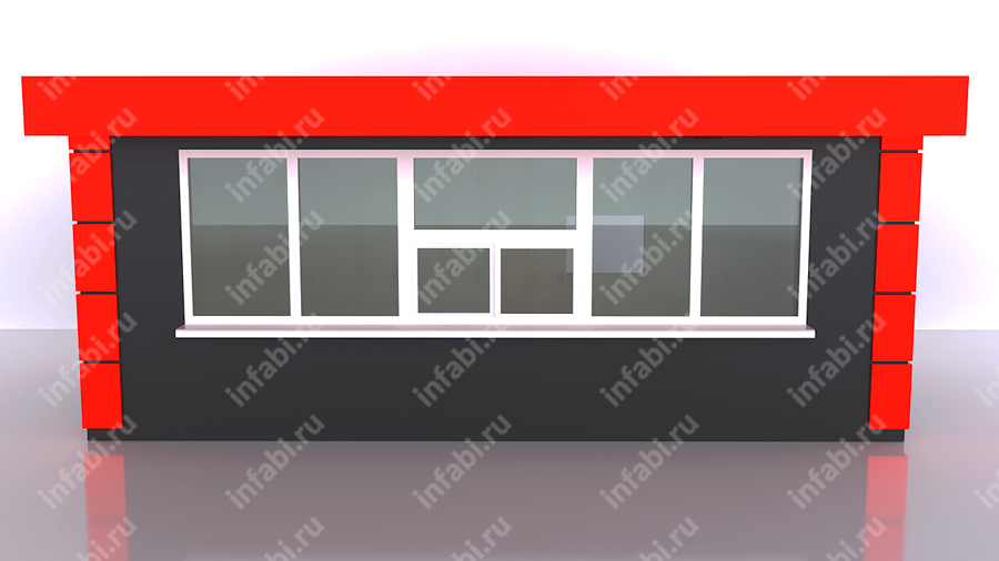 | Окна | Окна на фасаде высотой 1400 мм и небольшое окно на боковой части. Однокамерный глухой стеклопакет в ПВХ раме белого цвета. Форточка слайдер для обслуживания покупателей |