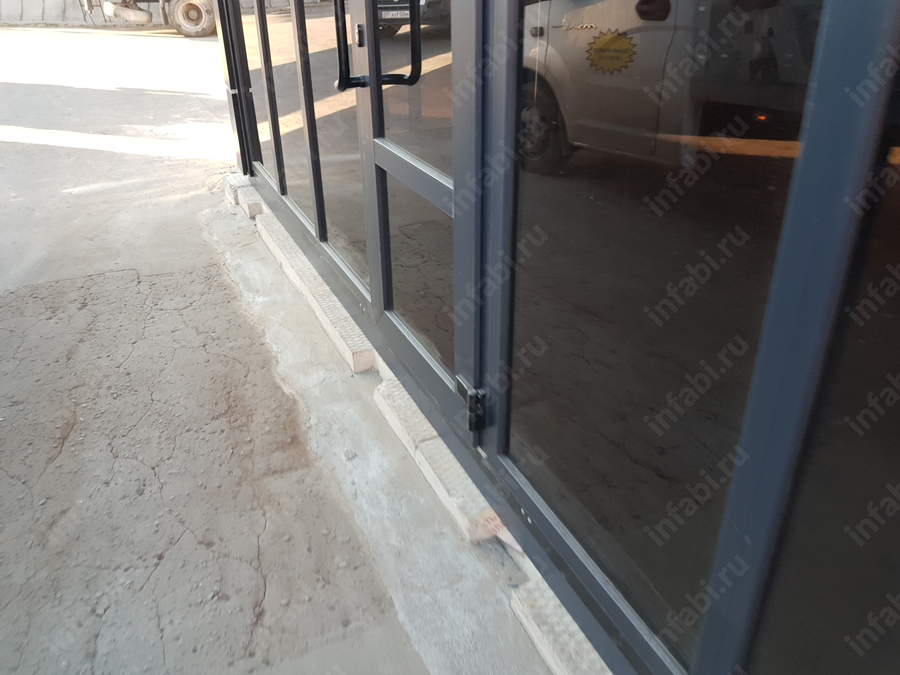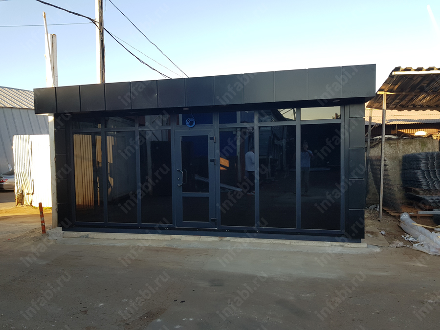 | Окна | Окна на фасаде высотой 1400 мм и небольшое окно на боковой части. Однокамерный глухой стеклопакет в ПВХ раме белого цвета. Форточка слайдер для обслуживания покупателей |