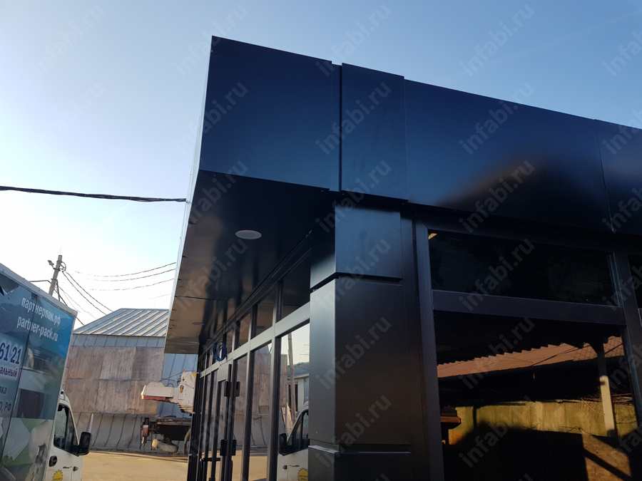 | Декоративные углы | Объемный декоративный козырек по периметру с выносным фризом с левой стороны. Передние углы декорируются Для декорирования использованы объемные углы — только перед. Задняя сторона простые классические углы. Углы изготовлены из гладкого металлического листа с полимерным покрытием (цвет по каталогу RAL) |