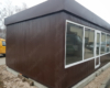 Отделка внешних стен гладкими металлическими панелями коричневого цвета. Смотрится очень стильно и современно.