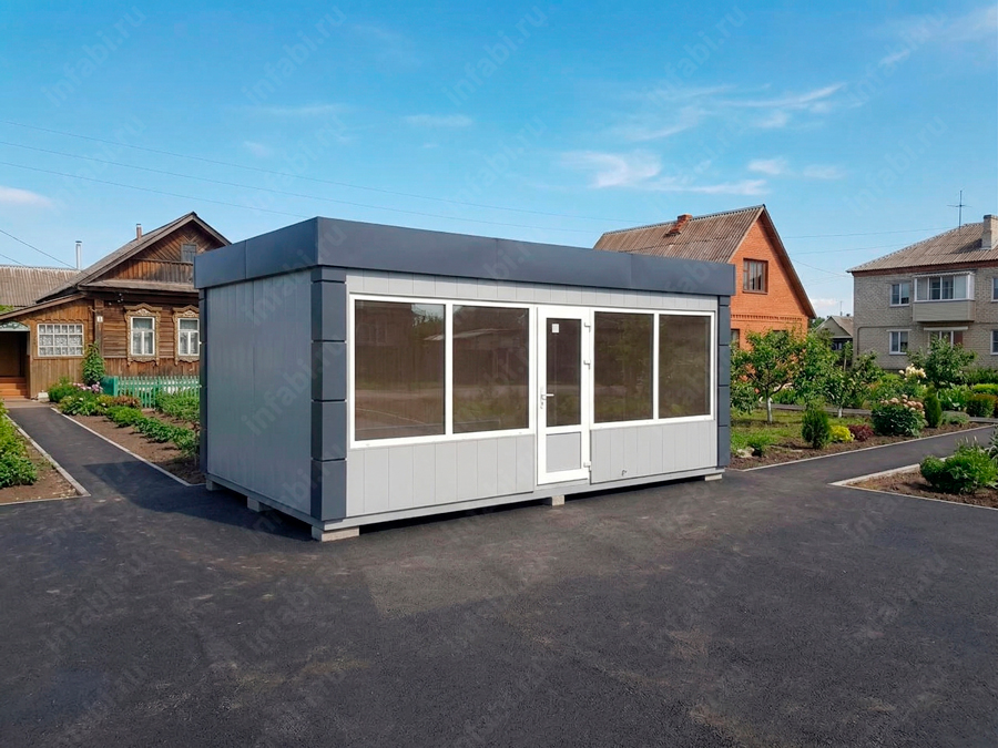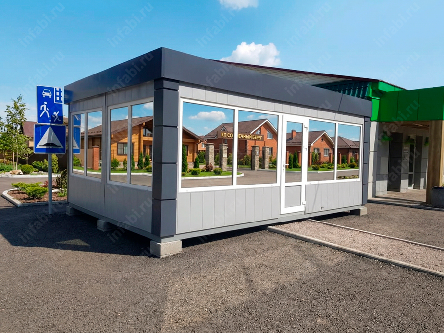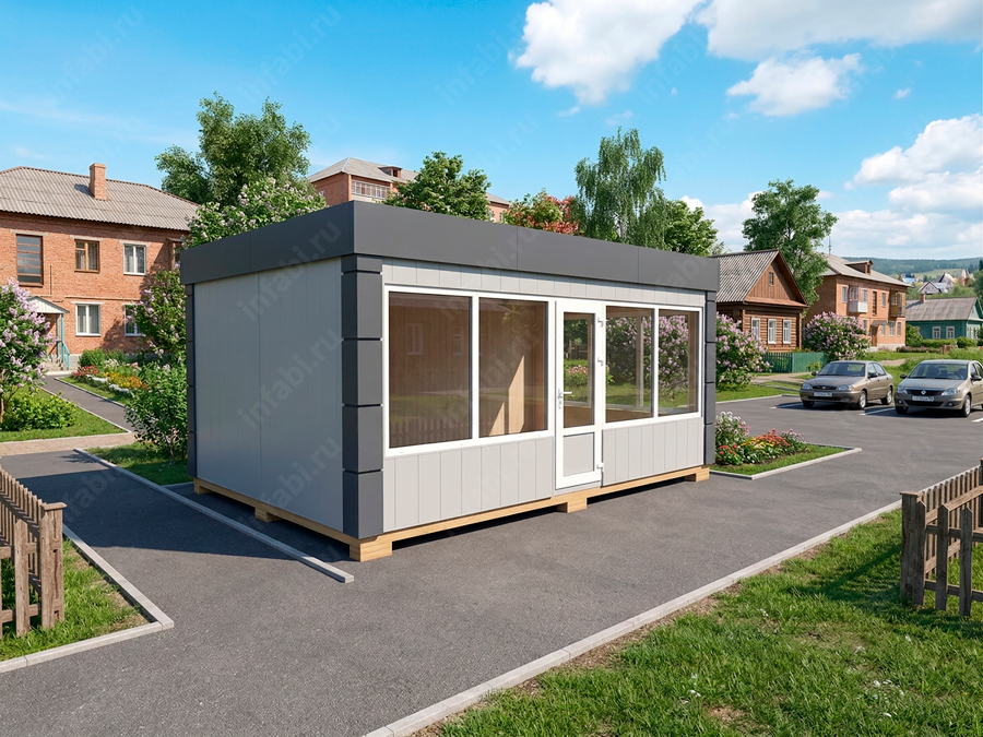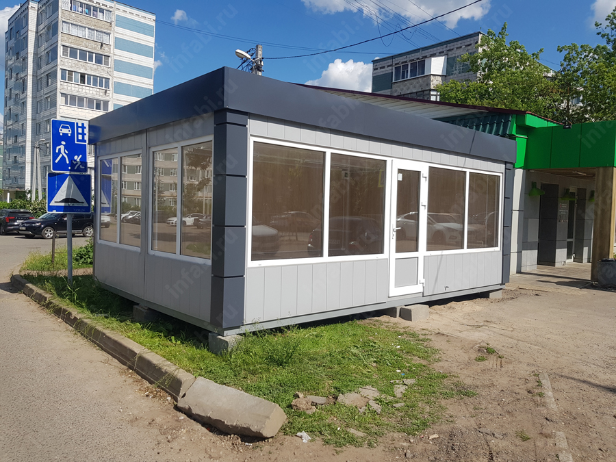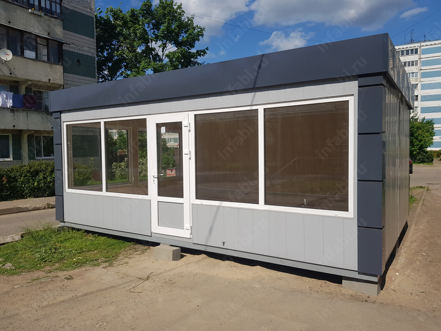 Модульный павильон «Продукты» изготовлен с большими витринными окнами и двухстворчатой дверью ПВХ. Может использоваться для реализации самой различной продукции, например для выпечки. Размер павильона 6х4 метра.
