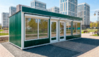 Модульный павильон «Точка покупок» отличается большой площадью и декоративным оформлением c объемными декоративными козырьком и углами. Высокие ростовые окна располагаются как на фасаде строения, так и по торцевым частям.