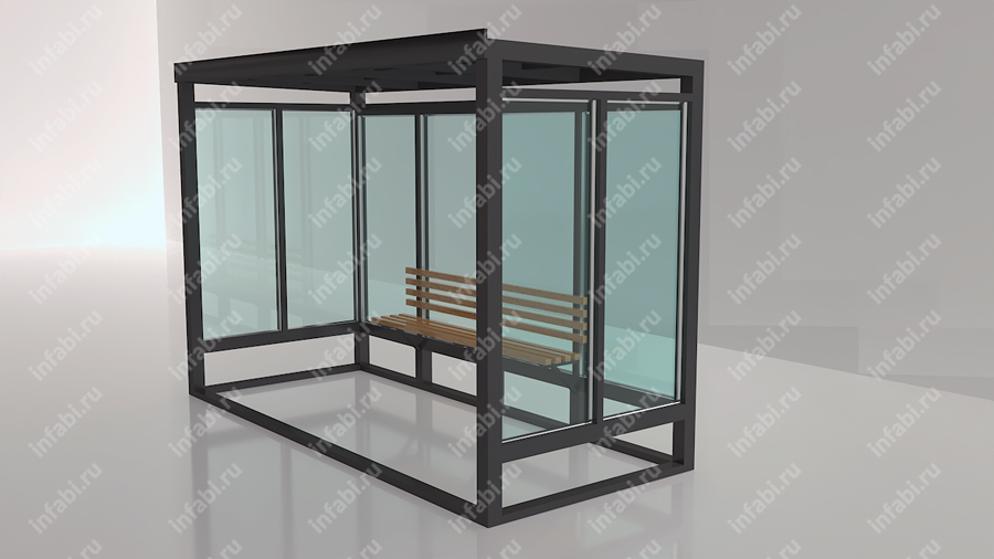 Для крепления изделия к поверхности предусмотрено основание из профильной трубы 100х50 мм. Стенки остановки остеклены триплексом. На крыше изделия с фронтальной части размещен фриз, на котором обозначается название остановки общественного транспорта.