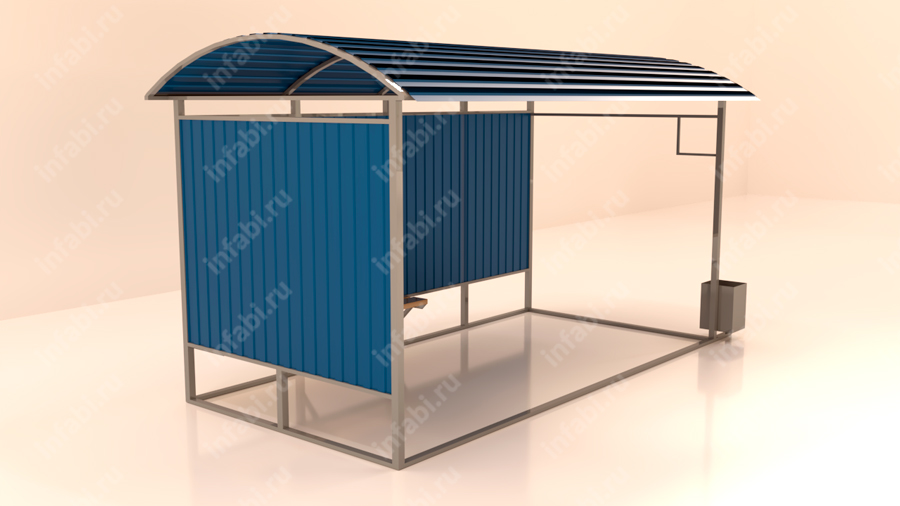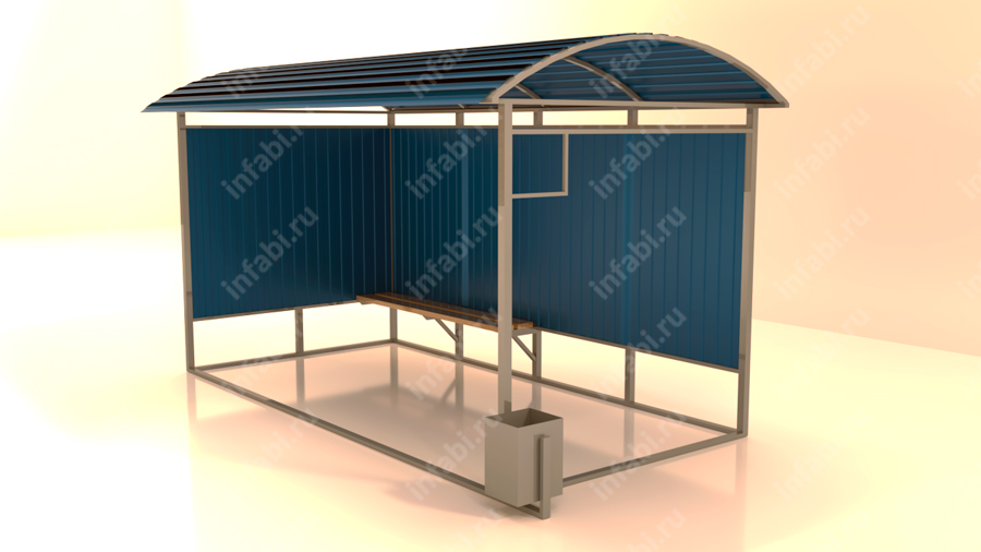 Отделка остановочного павильона осуществляется профлистом по одной боковой и задней стенкам. Фронтальная часть открыта. Также предусмотрены скамейка и урна. Модель оснащается скамьей по задней стенке.