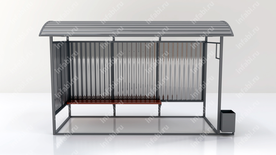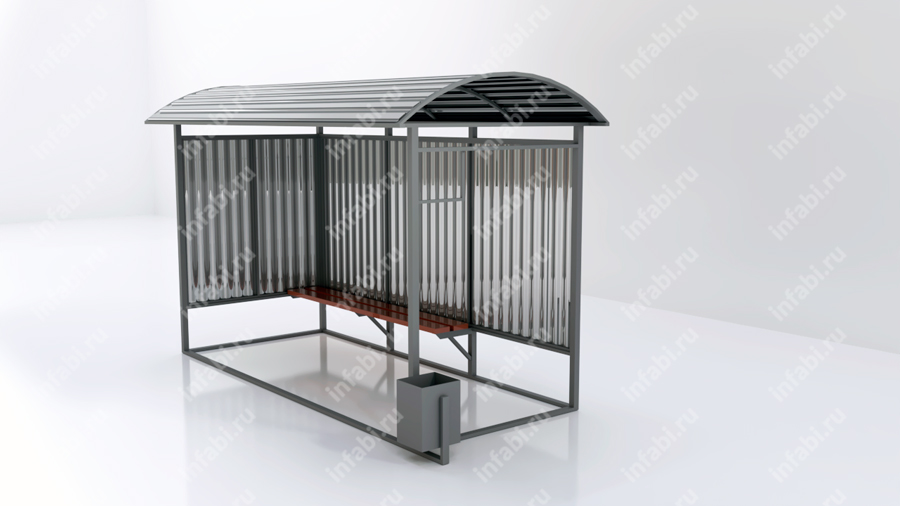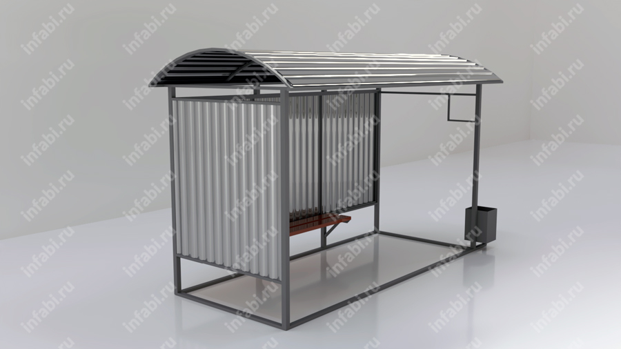Остановочный павильон или автобусная остановка — ОМ-1 — самая простая, но в то же время практичная модель автобусной остановки. Исполнение в металлическом каркасе с отделкой оцинкованным профилированным листом. Отделка остановочного павильона осуществляется листом по одной боковой и задней стенкам. Фронтальная часть открыта. Также предусмотрены скамейка и урна. Модель оснащается скамьей по задней стенке.