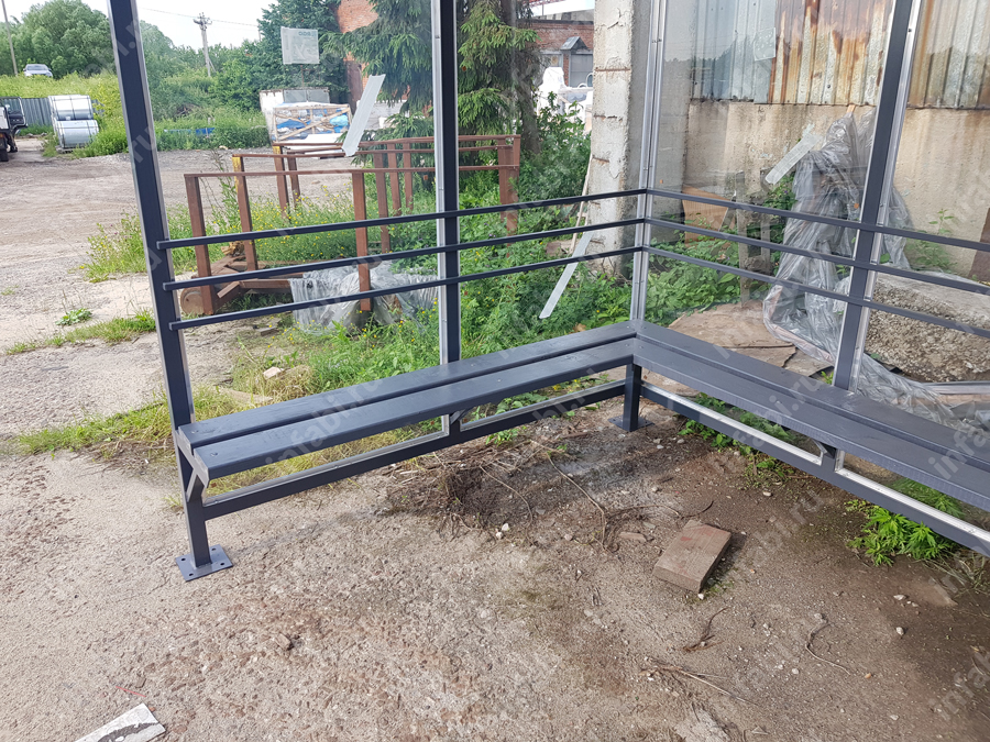 | Скамья | Без спинки. Вместо нее ограничители в 3 ряда из профильной трубы 20×20. Скамья по трем стенкам — деревянный настил с покрытием морилкой или эмалью |