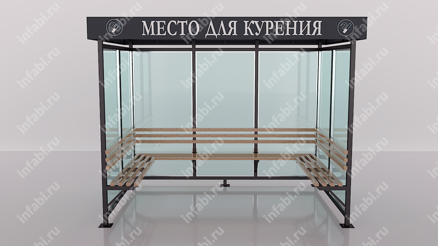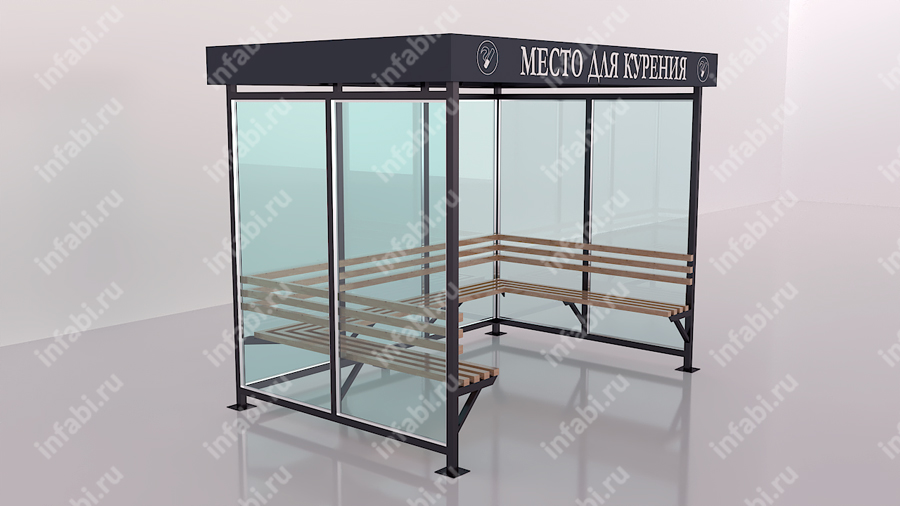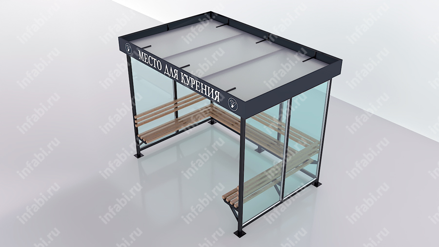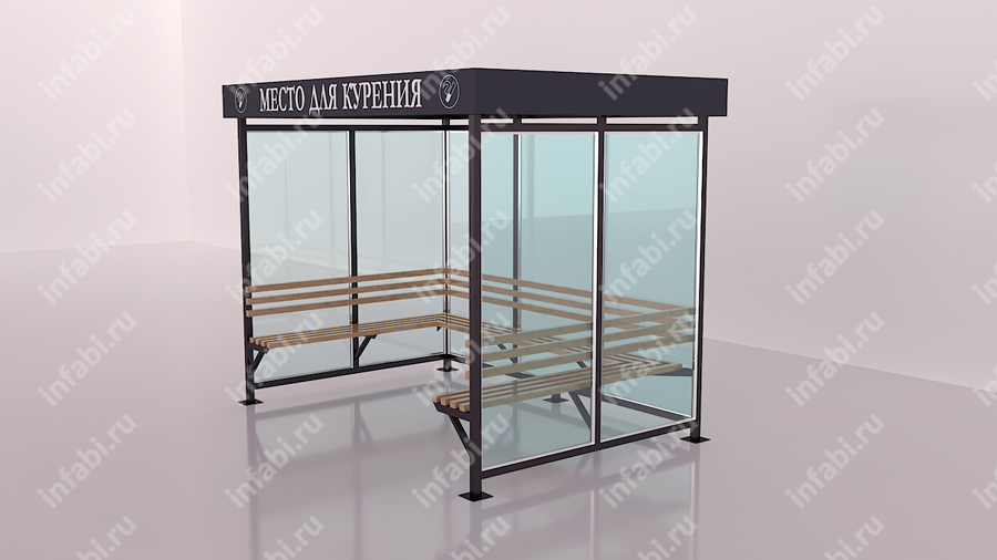 Павильон оснащен деревянной скамьей, что создает уютную и теплую атмосферу, а также обеспечивает комфортное расположение для курящих людей. Каркас и скамья могут быть выполнены в различных цветовых вариантах и материалах, что позволяет выбрать оптимальное решение для сочетания с дизайном бизнес-центра.