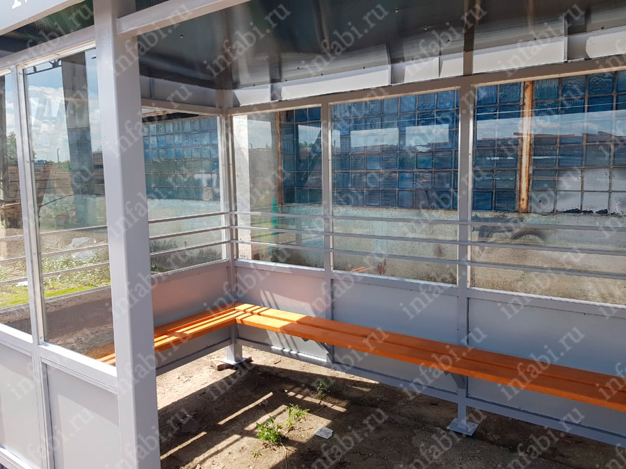 | Скамья | Без спинки. Вместо нее ограничители в 3 ряда из профильной трубы 20×20. Скамья по трем стенкам — деревянный настил с покрытием морилкой или эмалью |
