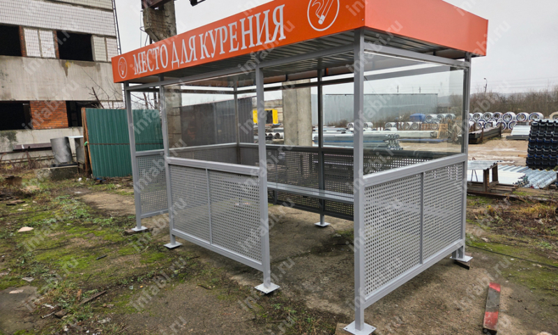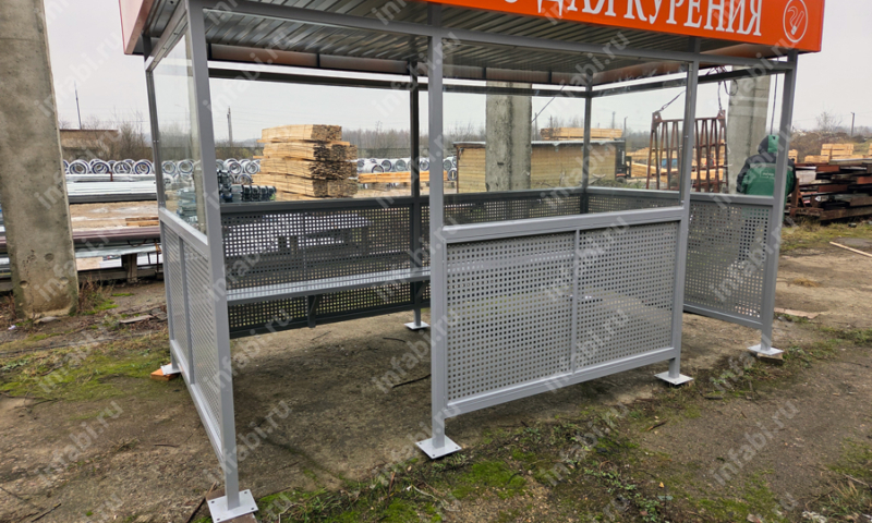 Павильон для курения КМ-14 (тип 2) — павильон для курения с внешней отделкой стеклом триплексом верхней части, и обшивкой металлическими листом с перфорацией цокольной части. Стильная и изящная беседка представляет собой сварную металлоконструкцию. Крыша обрамляется декоративным фризом с информационными надписями