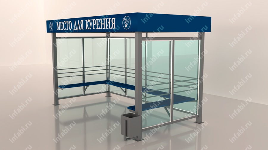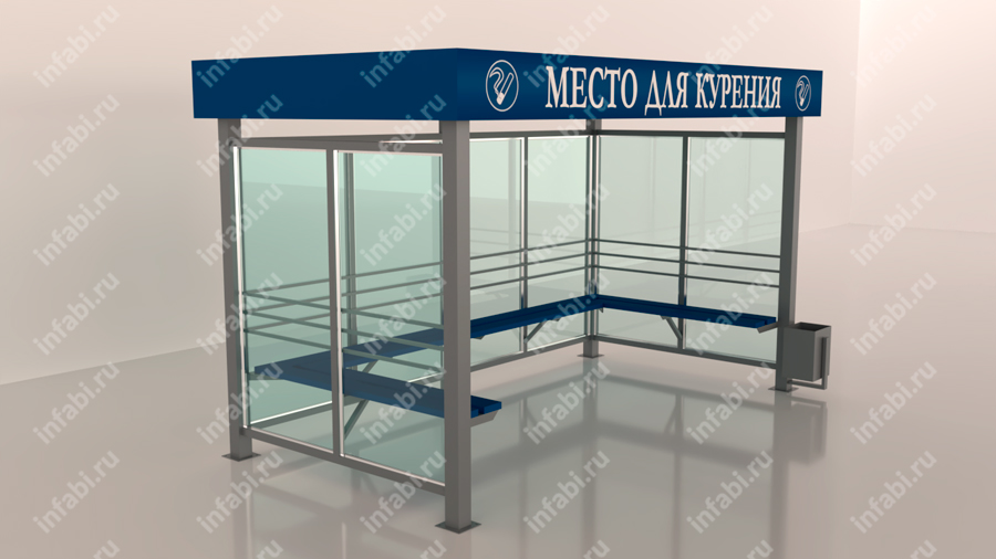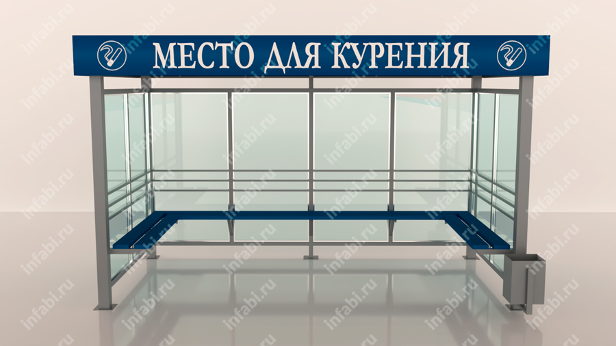 Довольно большая по размерам и вместимости. Устанавливается на территориях как промышленных зон, так и офисных центров. Фриз дополняется информационной надписью «Место для курения». По бокам надписи располагаются знаки «Курить здесь». Дополняется скамьей по трем сторонам павильона для курения.