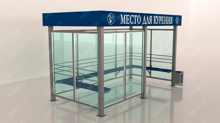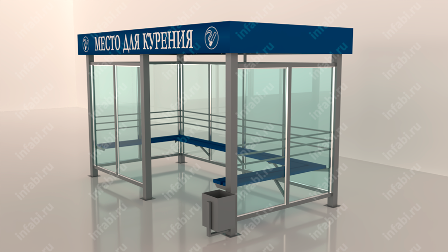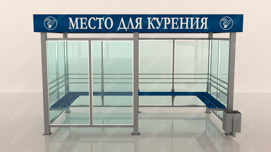Довольно большая по размерам и вместимости. Устанавливается на территориях как промышленных зон, так и офисных центров. Фриз дополняется информационной надписью «Место для курения». По бокам надписи располагаются знаки «Курить здесь». Дополняется скамьей по трем сторонам павильона для курения. На фронтальной части курилка дополнена остекленной стенкой,что делает внутреннее пространство павильона для курения более замкнутым и защищенным от факторов внешней среды.