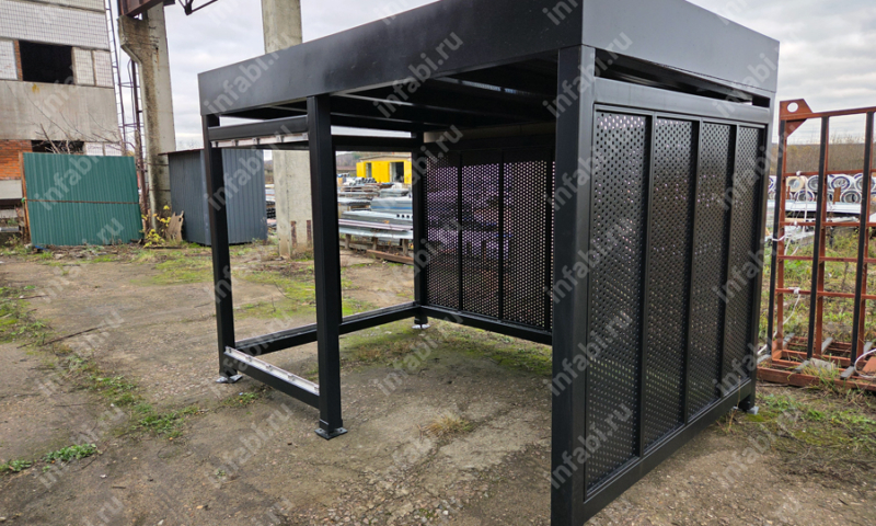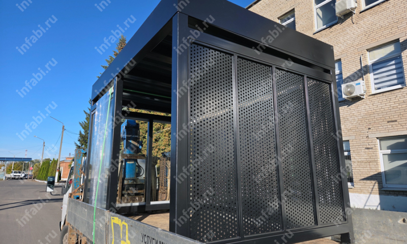 Основа павильона — жёсткий металлический каркас из профильных труб с двухслойным лакокрасочным покрытием, обеспечивающим защиту от коррозии и длительный срок службы. Габариты конструкции (4000×2000×2450 мм) обеспечивают комфортное размещение нескольких человек без излишнего занимаемого пространства.