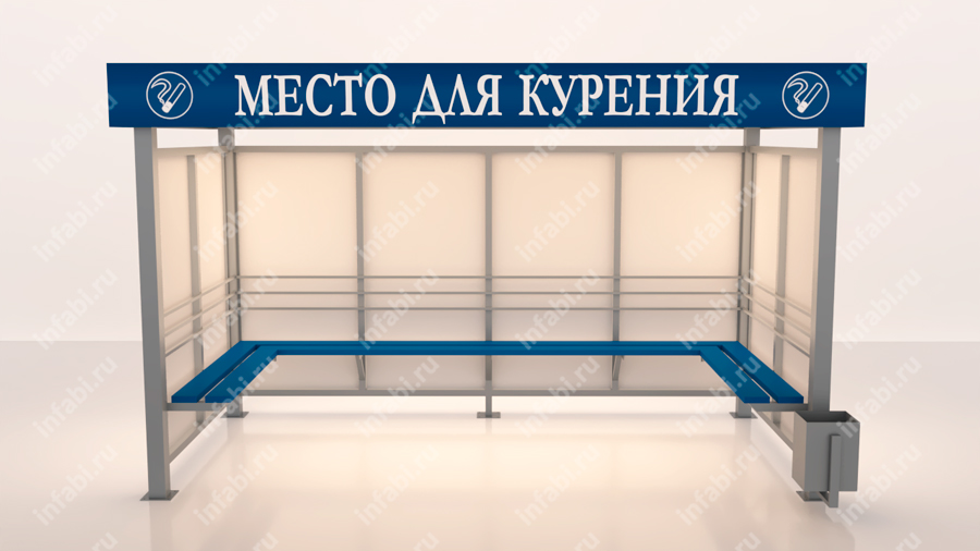 | Информационная надпись | Располагается на фризе с фронтальной стороны. Самоклеющиеся буквы белого цвета надпись: МЕСТО ДЛЯ КУРЕНИЯ, знак «Курить здесь» в виде «горящей сигареты» по обе стороны от надписи |