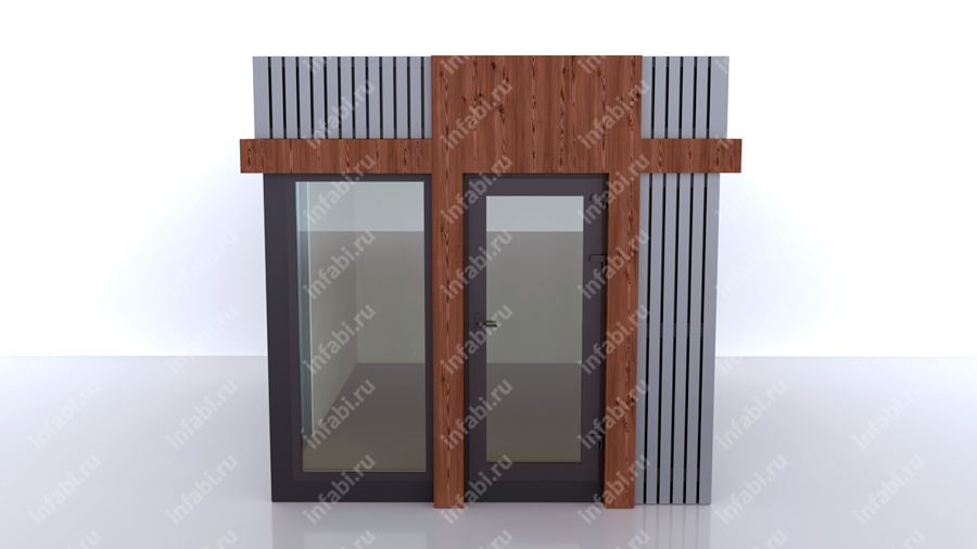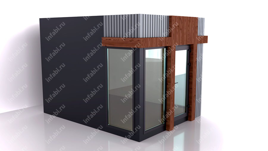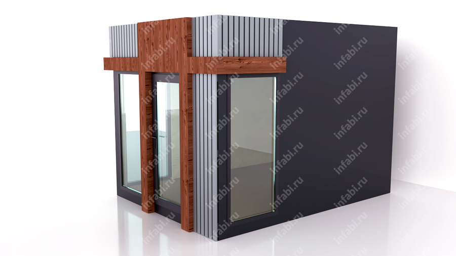 Торговый павильон из сэндвич-панелей 3х4 м (тип 2) представляет собой конструкцию с продуманным дизайном как внутри, так и снаружи, дополненный современными декор элементами. Остекление выполнено не только по фасадной части, но и частично по боковым стенам, что увеличивает обзор и визуально расширяет пространство. Сочетание темной цветовой гаммы внешней отделки с деревянными вставками сходных оттенков придает павильону выразительность в городской среде, тем самым способствуя притоку посетителей и повышая престиж торговой точки.