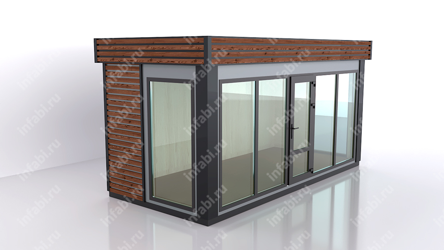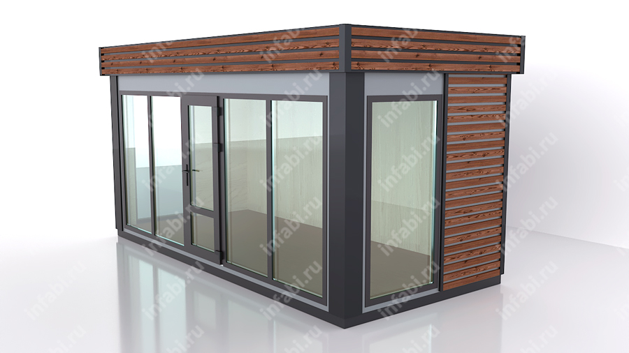 | Внешняя отделка | Вертикальные гладкие панели шириной 240 мм из оцинкованного листа с полимерным покрытием (цвет на выбор по каталогу RAL), отделка внешних передних углов фасадными кассетами (цвет по каталогу RAL) Внешние углы декорированы деревянными рейками. Комбинированное декорирование внешних углов. Передний и задний с деревянными рейками, левый передний угол из гладкого листа с полимерным покрытием. |