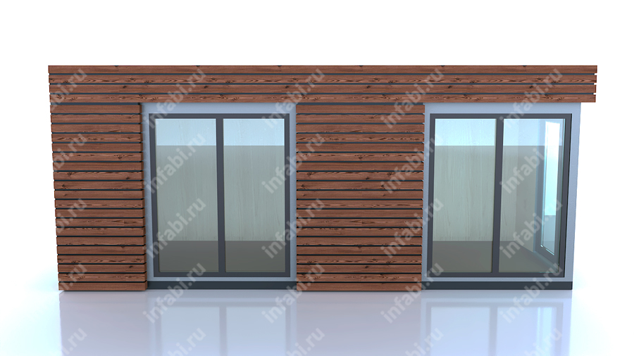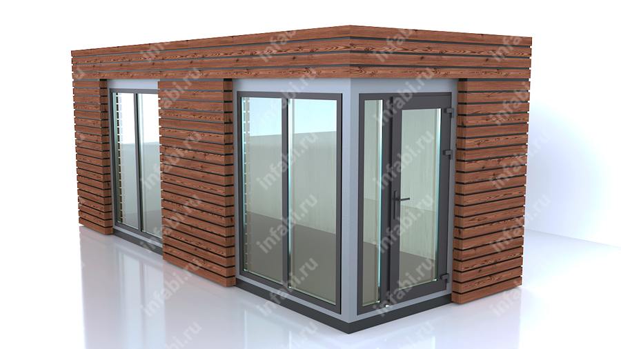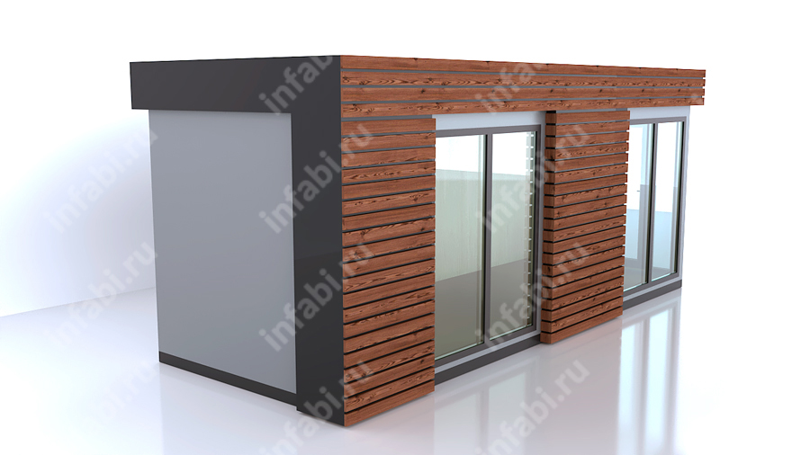 | Внешняя отделка | Вертикальные гладкие панели шириной 240 мм из оцинкованного листа с полимерным покрытием (цвет на выбор по каталогу RAL), отделка внешних переднего и заднего углов объемными элементами с декоративными планками (цвет по каталогу RAL) Комбинированное декорирование внешних углов. Два внешних диагонально противоположных угла декорированы деревянными планками. Оставшиеся два декорированы стандартным уголком из гладкого листа. Также задекорирована центральная часть фасада павильона. На этот декор можно разместить информационные материалы, прайсы, указатели, светящуюся рекламу |