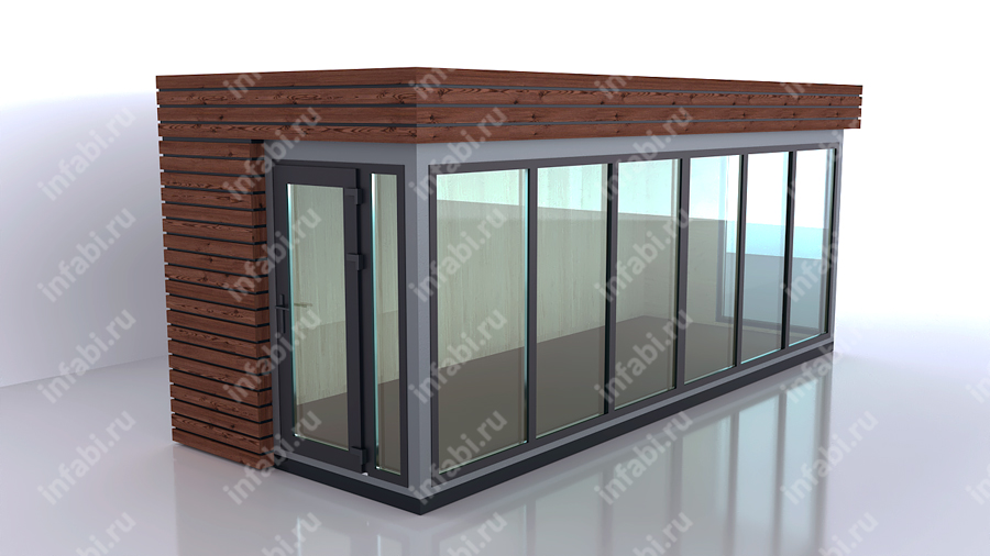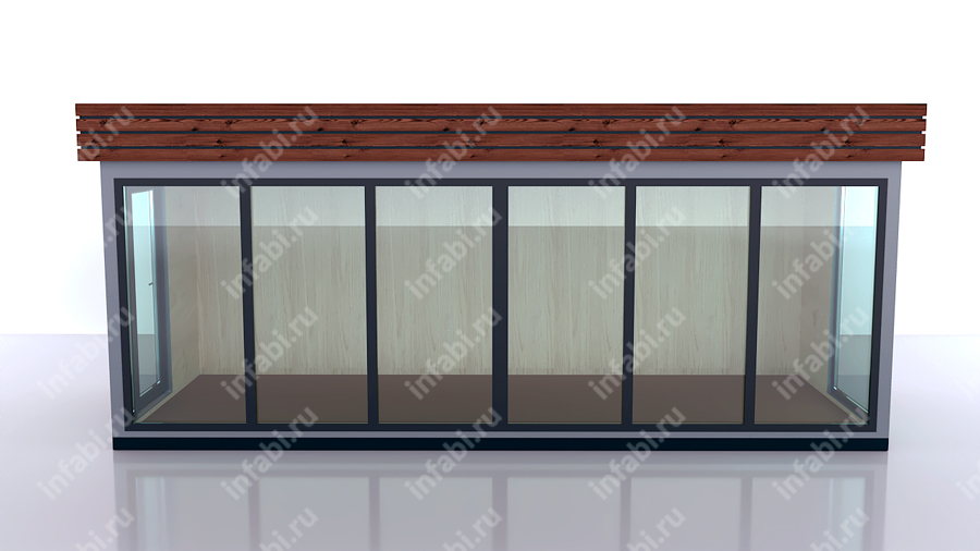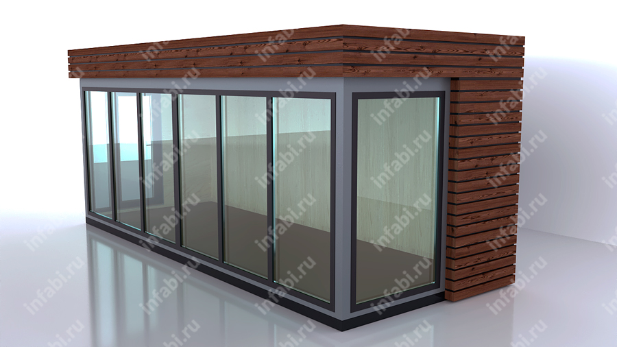 | Внешняя отделка | Вертикальные гладкие панели шириной 240 мм из оцинкованного листа с полимерным покрытием (цвет на выбор по каталогу RAL), отделка внешних переднего и заднего углов объемными элементами с декоративными планками (цвет по каталогу RAL) Комбинированное декорирование внешних углов. Два внешних диагонально противоположных угла декорированы деревянными планками. Оставшиеся два декорированы стандартным уголком из гладкого листа. На этот декор можно разместить информационные материалы, прайсы, указатели, светящуюся рекламу |