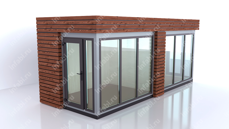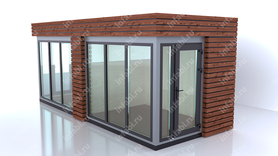 | Внешняя отделка | Вертикальные гладкие панели шириной 240 мм из оцинкованного листа с полимерным покрытием (цвет на выбор по каталогу RAL), отделка внешних углов объемными элементами с декоративными планками (цвет по каталогу RAL) Декорирование задних внешних углов деревянными планками. Передние углы декорированы стандартным уголком из гладкого листа. Также декор по центру фасада. На этот декор можно разместить информационные материалы, прайсы, указатели, светящуюся рекламу |